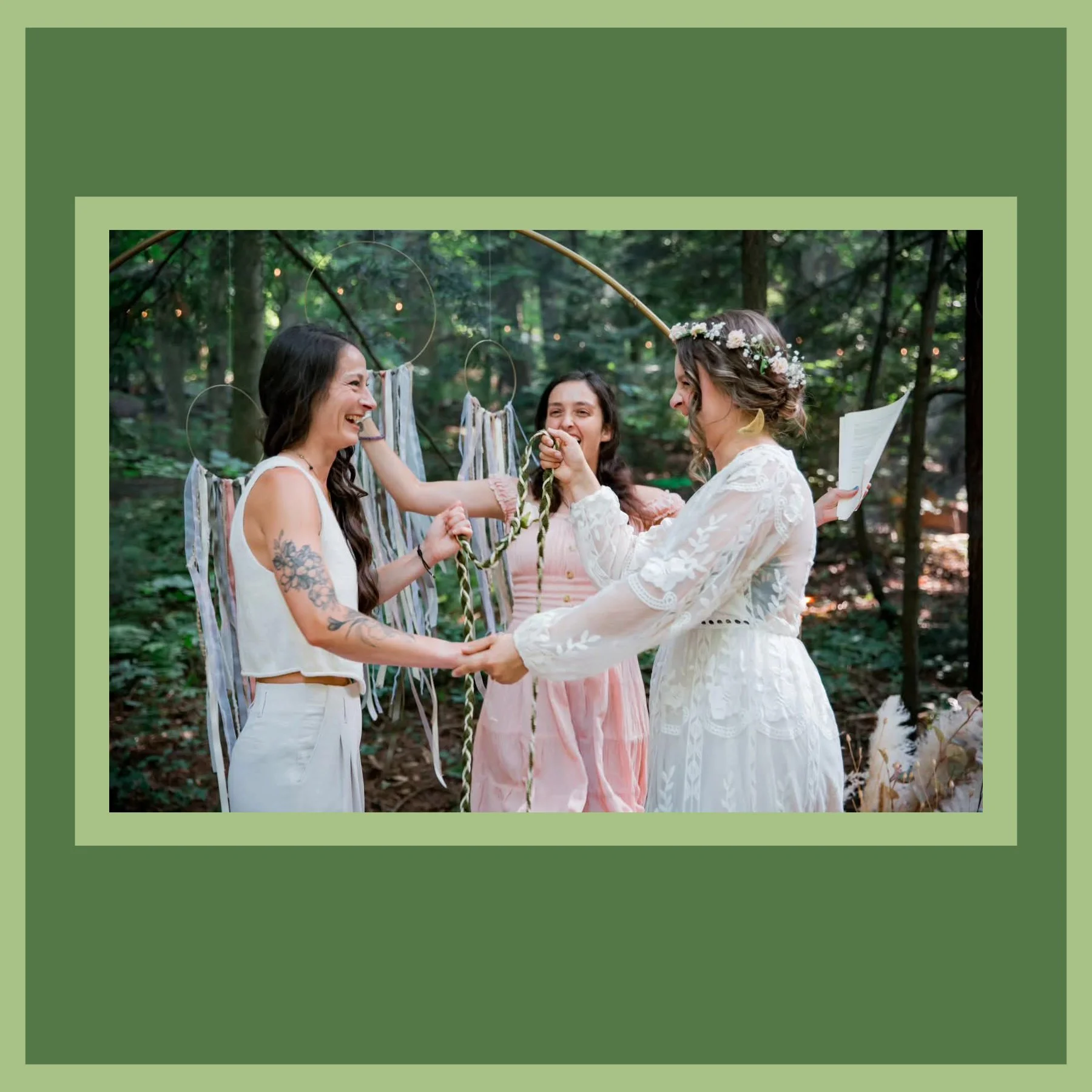 Handfasting, an ancient Celtic-Pagan tradition, was historically a symbolic promise to last a year plus one day, when, if successful, the couple would officially marry. It has been popular among the Queer community as a binding of intention and a ritualization of love long before the government decided it was “allowed”. There are so many variations of the ritual, and most practitioners have developed their own system and method for performance. Some couples choose to have the handfasting be the entirety of the ceremony, but my girls chose to have it coincide and compliment a more traditional-to-them ceremony script.